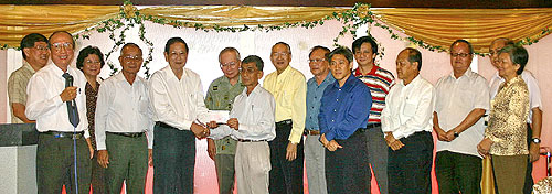 砂南大校友会古晋分会财政许开明(左七),代表校友会移交支票给中