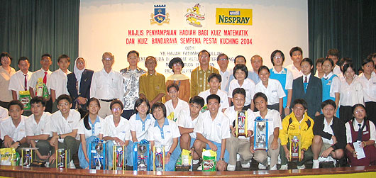 至于三年挑战杯则由古晋中华第一中学夺得。首长署助理部长法帝玛陈赛明受邀主持颁奖礼。 古晋中华第一中学与古晋中学则夺下了常识比赛组中的亚军及季军宝座; 至于数学比赛组中,荣获亚军及季军的学校分别为青草路政府中学及古晋中学。 本年度的古晋节常识比赛共获得了39所学校约156名学生的参与。至于数学组方面,共获得36所约144名学生的参与。 |